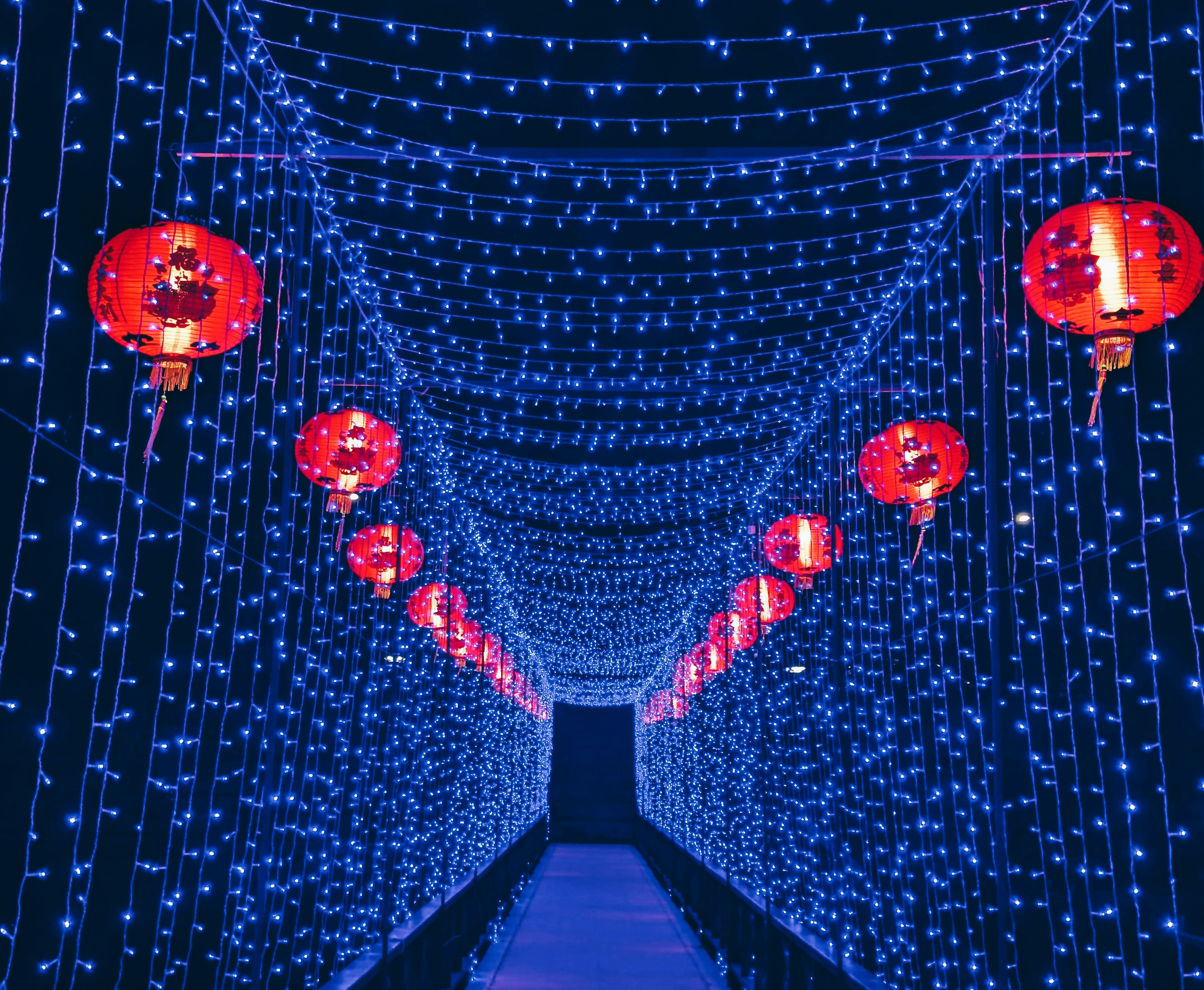 a tunnel of blue lights with red lanterns