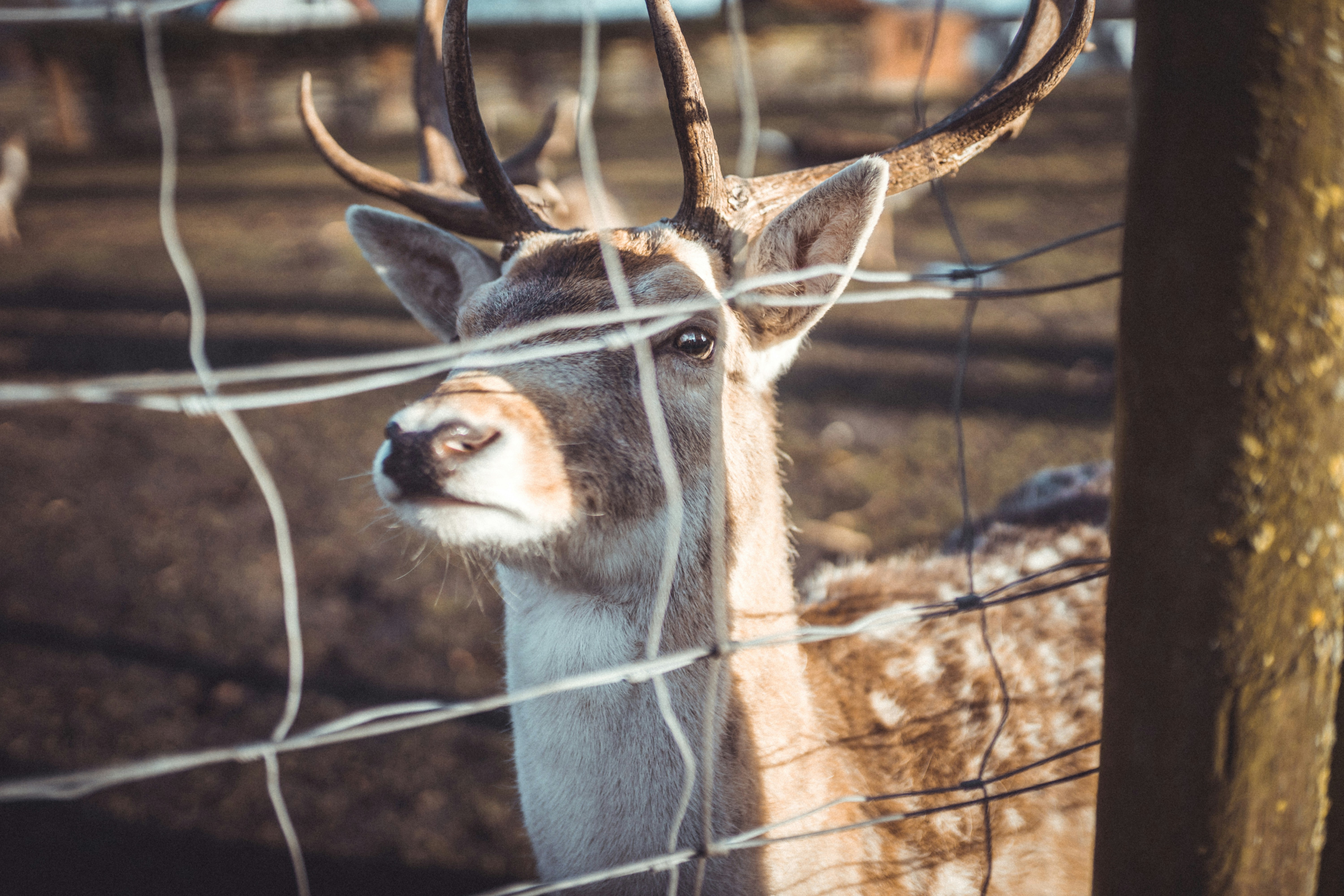 selective focus photography of brown deer behind fence