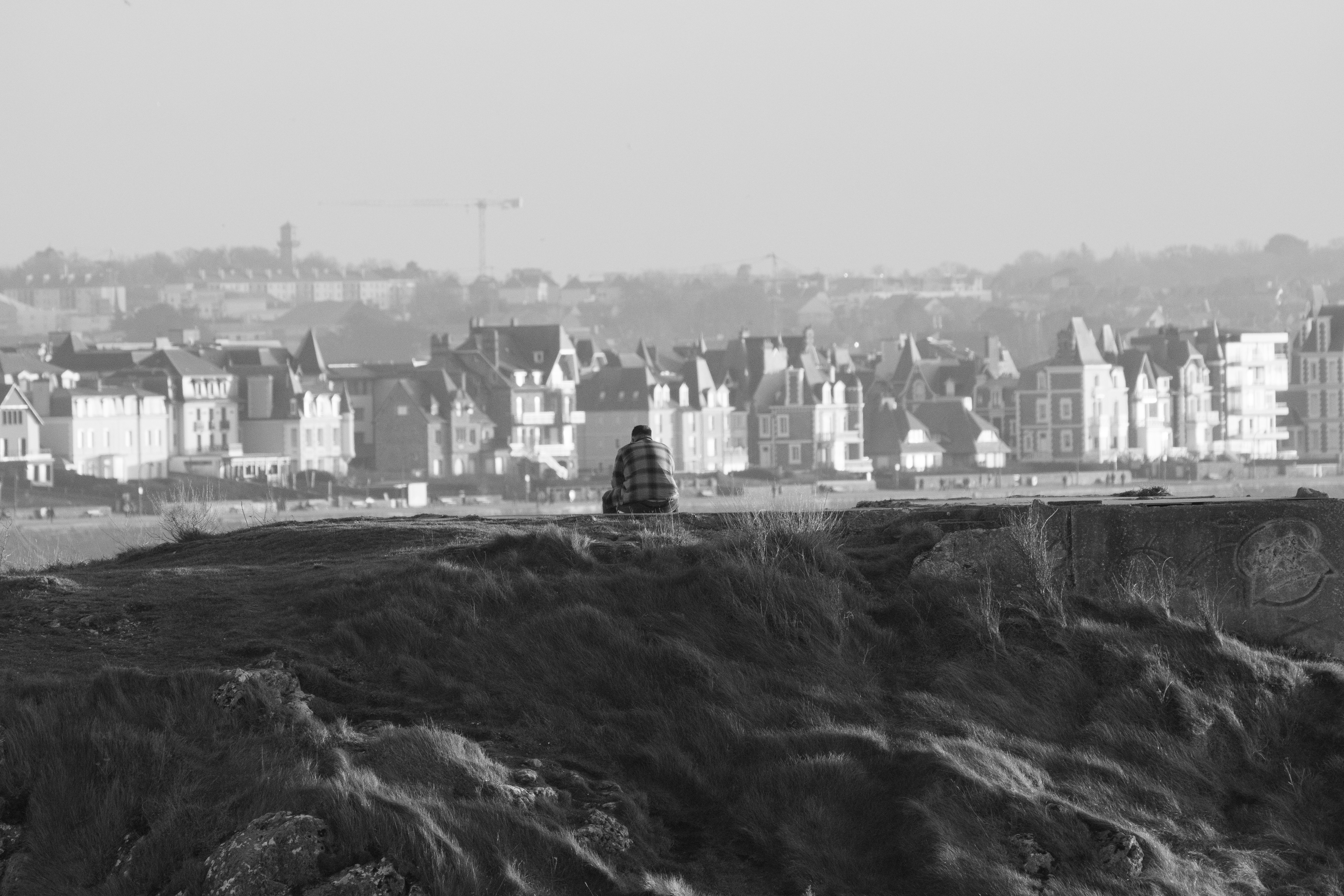 a black and white photo of a person sitting on top of a hill