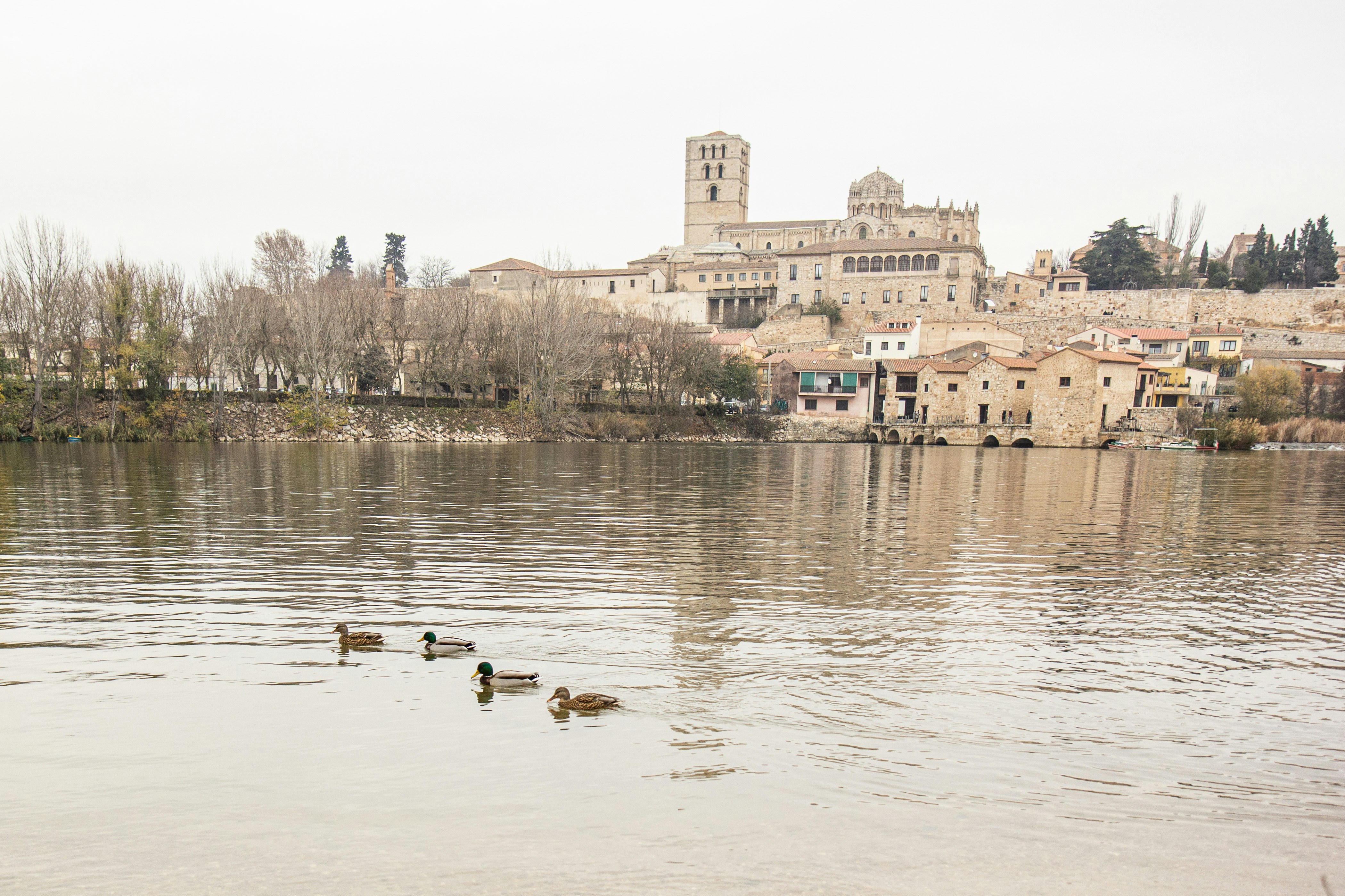 a group of ducks swimming in a lake with a building in the background