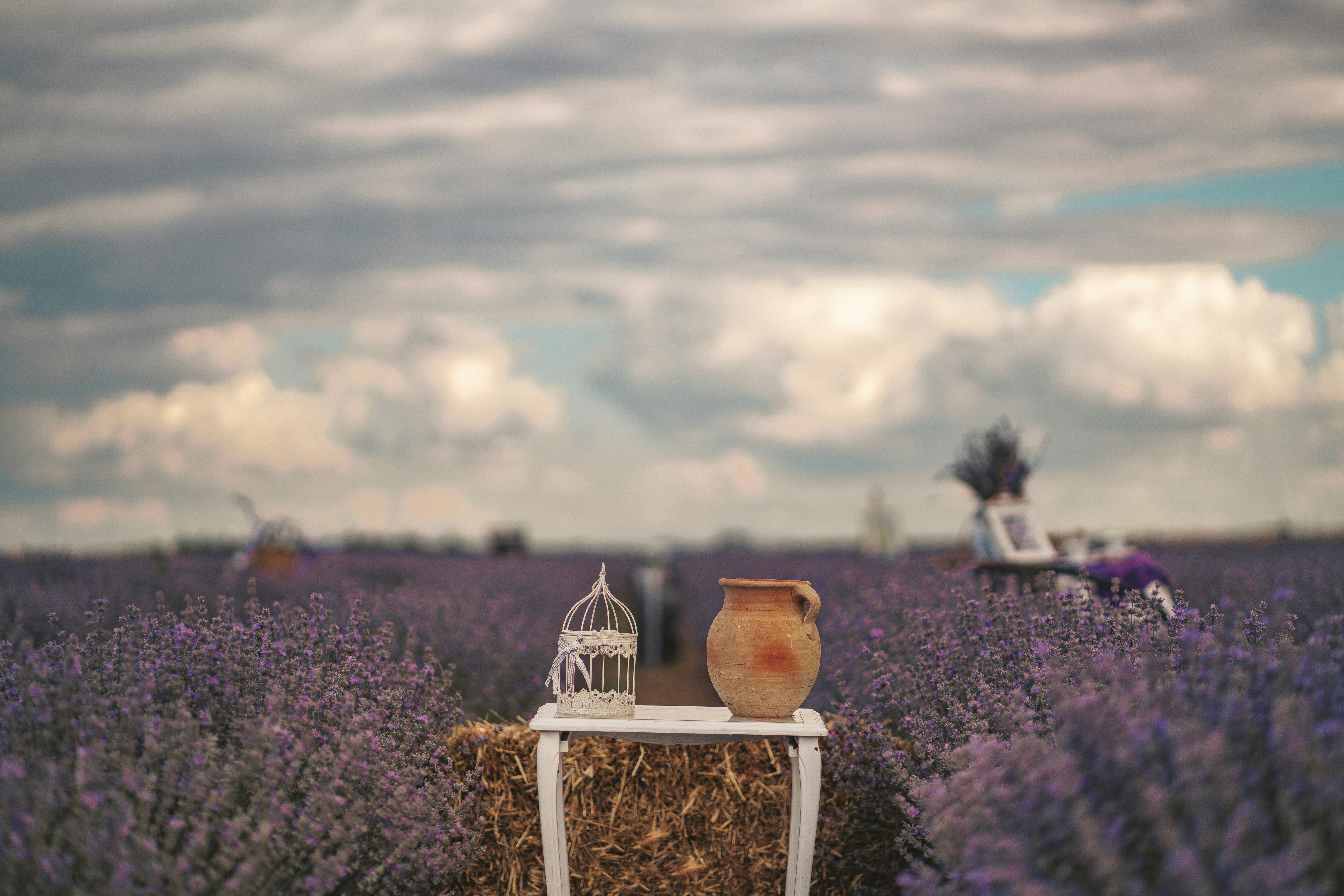 a vase sitting on top of a table in a field
