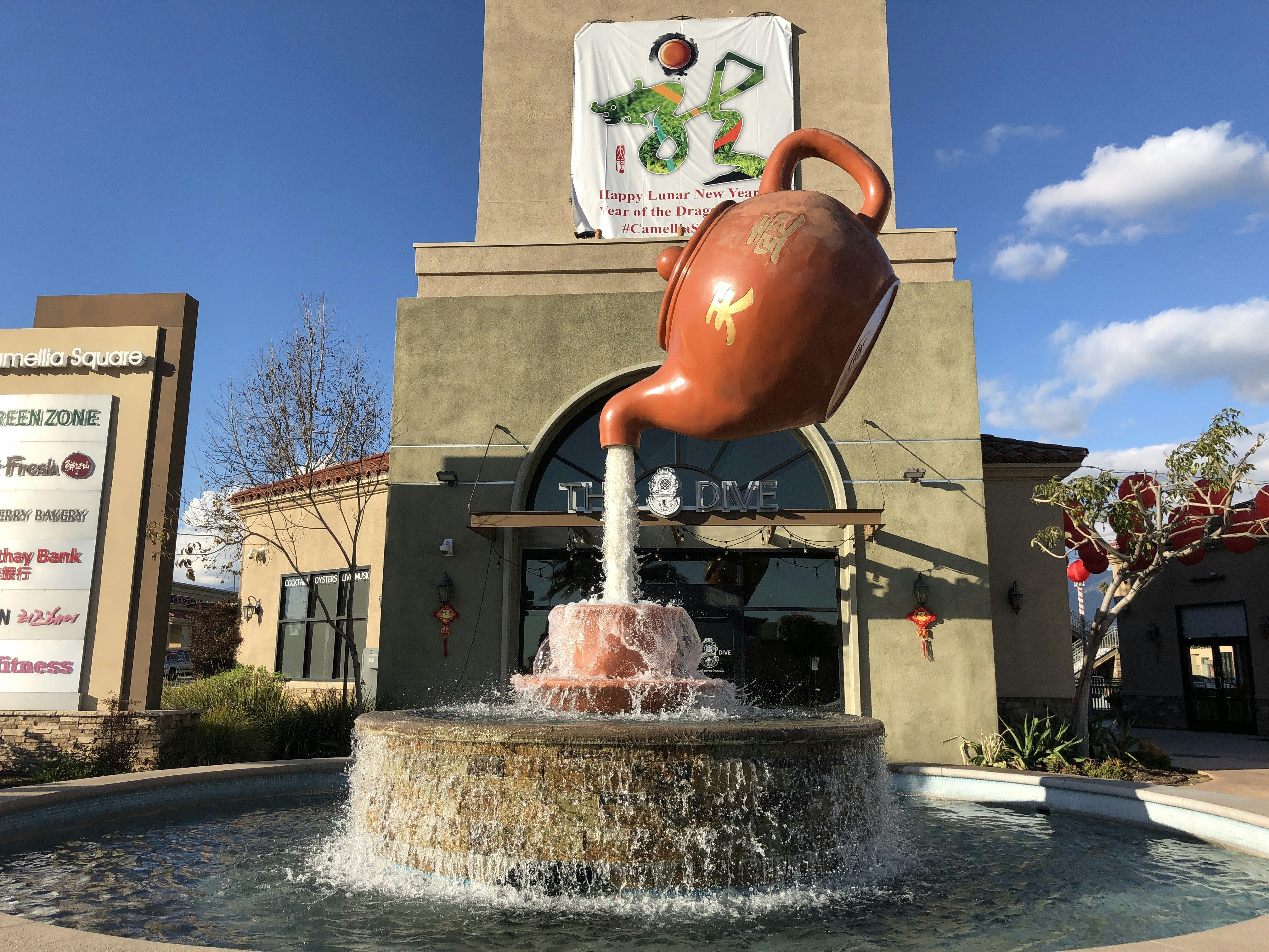 a water fountain with a tea pot on top of it